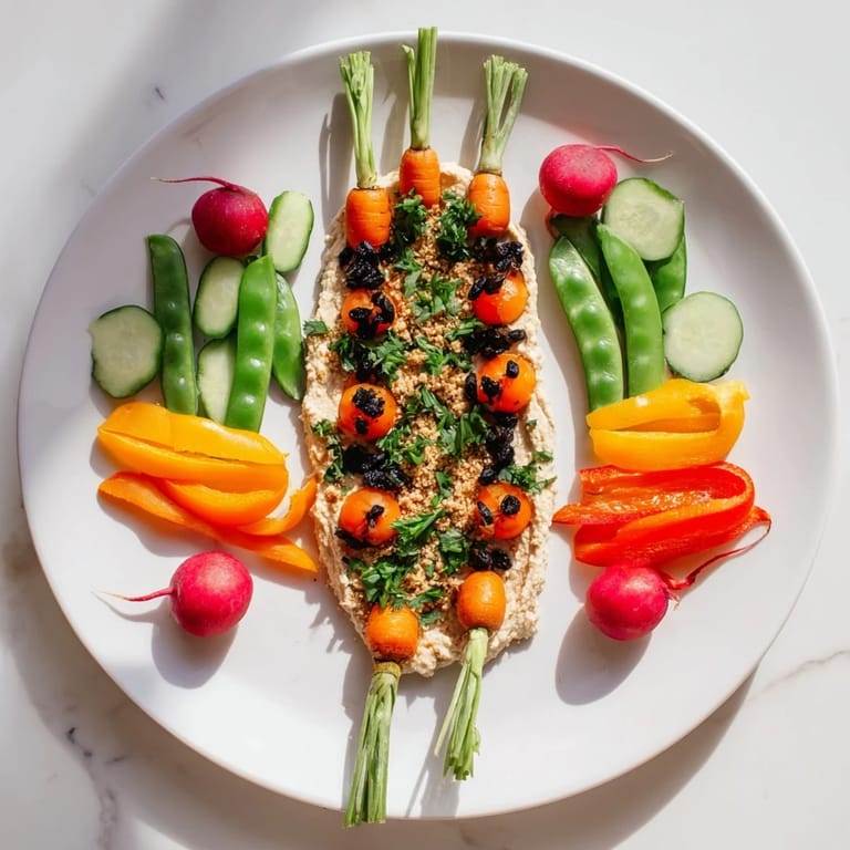 Pin this A whimsical and vibrant vegetable platter designed to resemble a garden carrot patch, complete with a creamy soil dip. Perfect for spring gatherings, Easter, or healthy snacking.