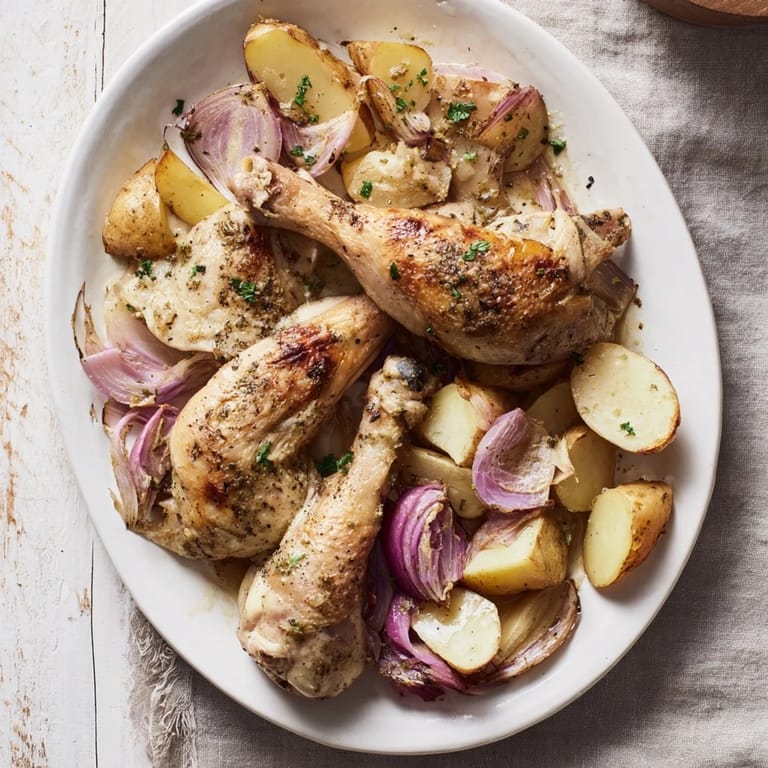 Pin this A vibrant, one-pan Greek-inspired dish featuring juicy lemon chicken and golden potatoes, all roasted together with herbs and garlic for a flavorful, budget-friendly meal.