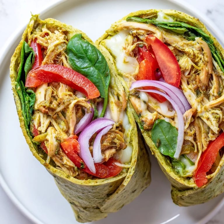 If you have a panini press or cast iron, warming the finished wrap briefly creates a crust that feels more substantial and makes the cheese slightly melty. Some people add a tablespoon of cream cheese mixed into the pesto for richness, or they grill the chicken first for smokier flavor instead of using it plain. The wrap invites creativity without demanding it—you can eat it as written or customize it endlessly depending on your mood and what's calling to you that day.
