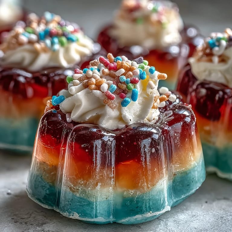 Pin this The first time I put together these Rainbow Jello Cups, I remember the kitchen counter looking more vibrant than usual—boxes of Jello spread out like little color flags. My niece wandered over, drawn by the sharp fruity aromas escaping from each package, her eyes growing round with anticipation. Between giggles and the occasional sticky spoon mishap, the process felt more like painting than cooking. Watching each layer take shape was oddly satisfying. I found myself rooting for each new color to set perfectly, hoping my hand would be steady enough to create razor-straight stripes.