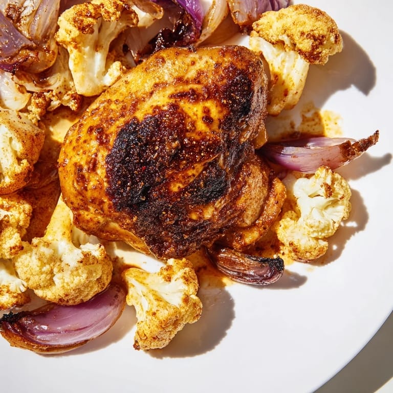 - Cook for 25 to 30 minutes until the chicken reaches 165°F internally and the cauliflower is tender with caramelized edges
